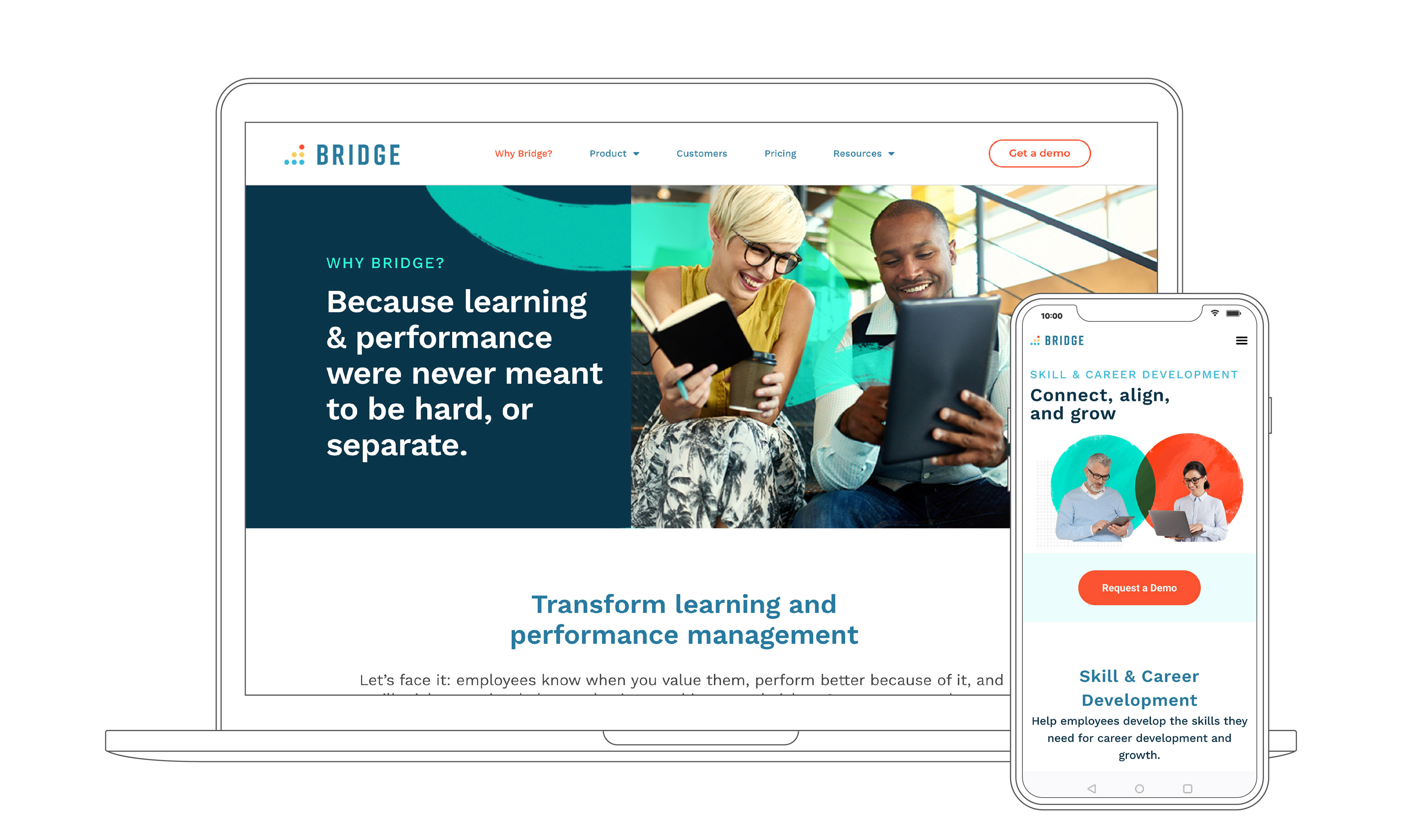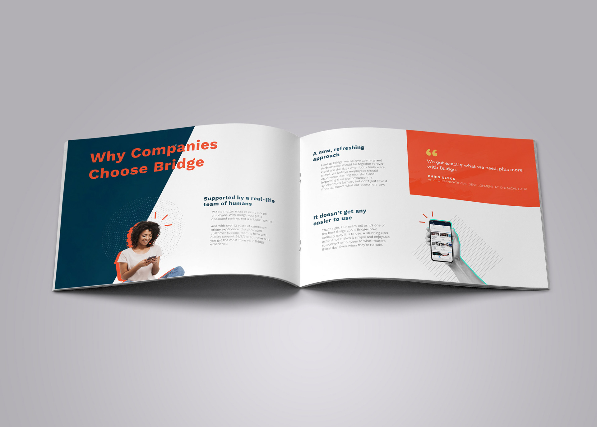 I developed the new Bridge brand that focused on people – and how Bridge helps them connect, align, and grow. I wanted the brand to feel energetic, unique, professional, and somehow include astronauts and motorcycles. Because those are cool.